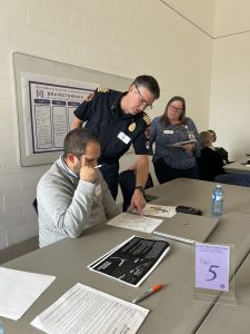 Orillia Fire Chief Chris Ferry (standing) discusses hospital evacuation plans with Tom Roberts, EVP-Corporate Services and CFO at Orillia Soldiers’ Memorial Hospital, during a mock training exercise at the Orillia Recreation Centre November 14th.